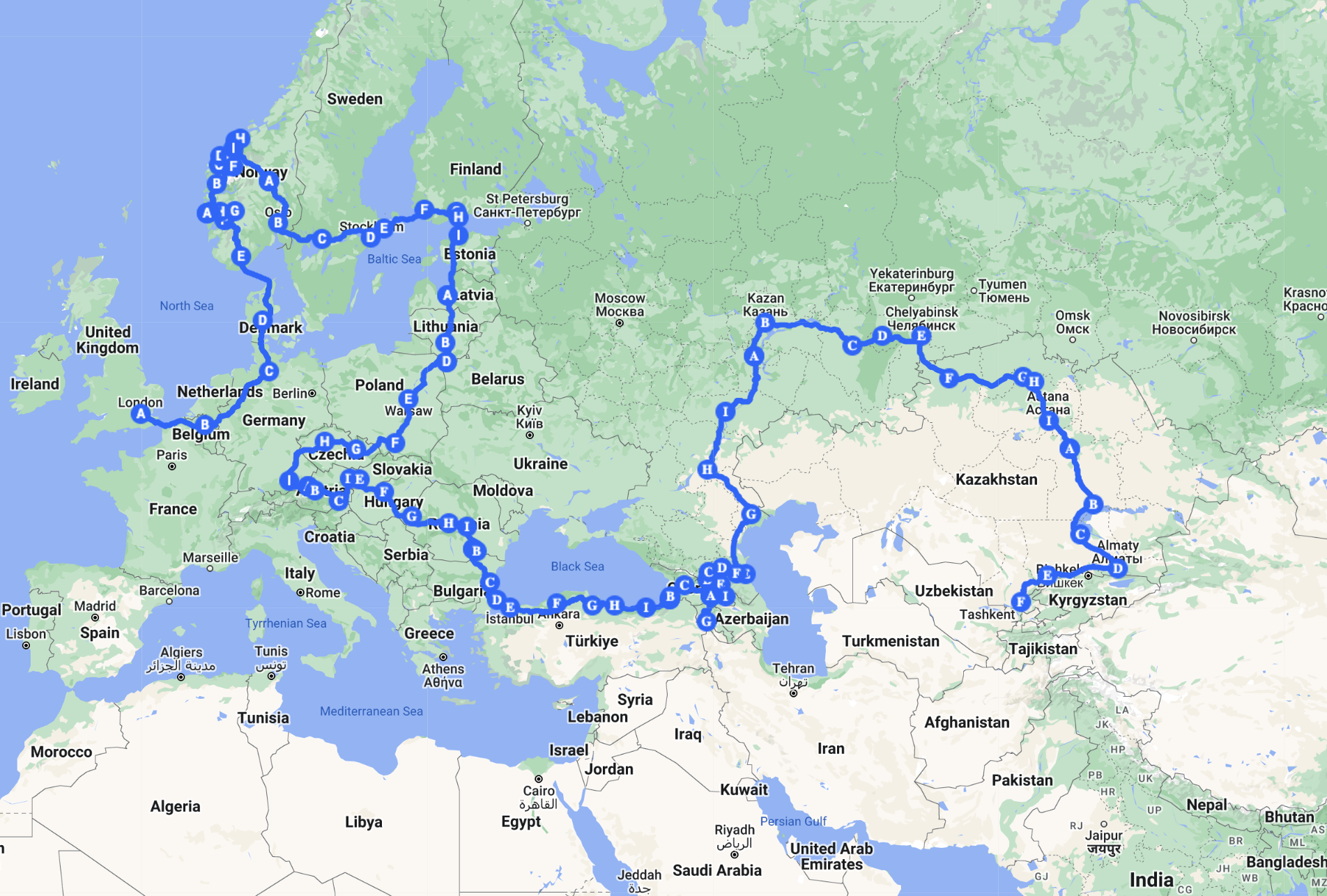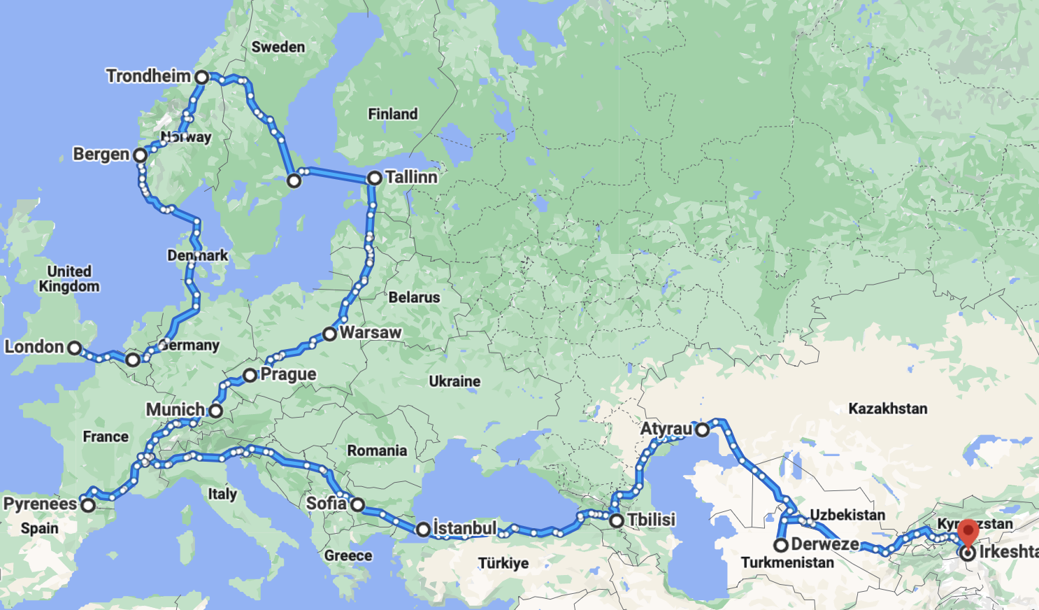 London to Kyrigistan path that I originally planned to take via Scandanavia, Georgia, Russia, Kazakhistan. Google map does not show route in China so could not map it all the way to India. Its 10k miles (15k kms) till Kyrgistan but should reach 20k mark till India. Google Map link of the path in detail