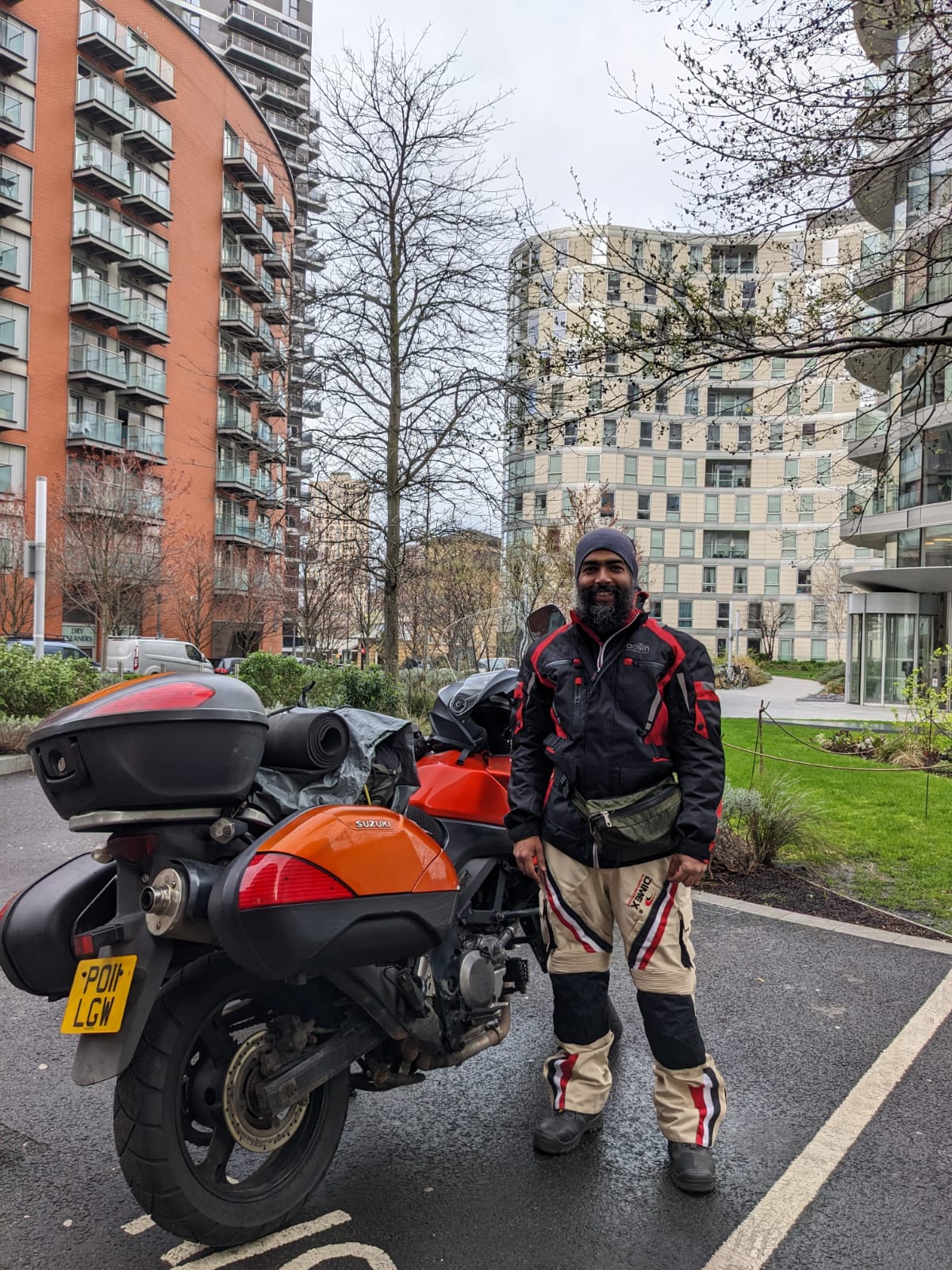 | Posing with my motorcycle at New Providence Wharf, London on March 30, 2023, just before starting the ride | |
